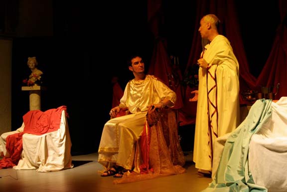 Gli ultimi giorni di Caligola, vengono in questo spettacolo, scandagliati, analizzati, valutati, per capire, per non dare giudizi sommari o errati. La sua lucida follia, che cerca la logica portata all’esasperazione, l’abbandono ad un lirismo disumano spinto fino all’assurdo, il dolore per la morte della sorella-amante, il travaglio interiore di un imperatore che brancola senza pace per le stanze del palazzo imperiale, ci danno un quadro desolante di un uomo che soffre la solitudine di chi è condannato all’isolamento, proprio dei mostri o dei potenti; lui ama senza amore e vive una vita che nel suo spirito sta morendo tra atroci tormenti!